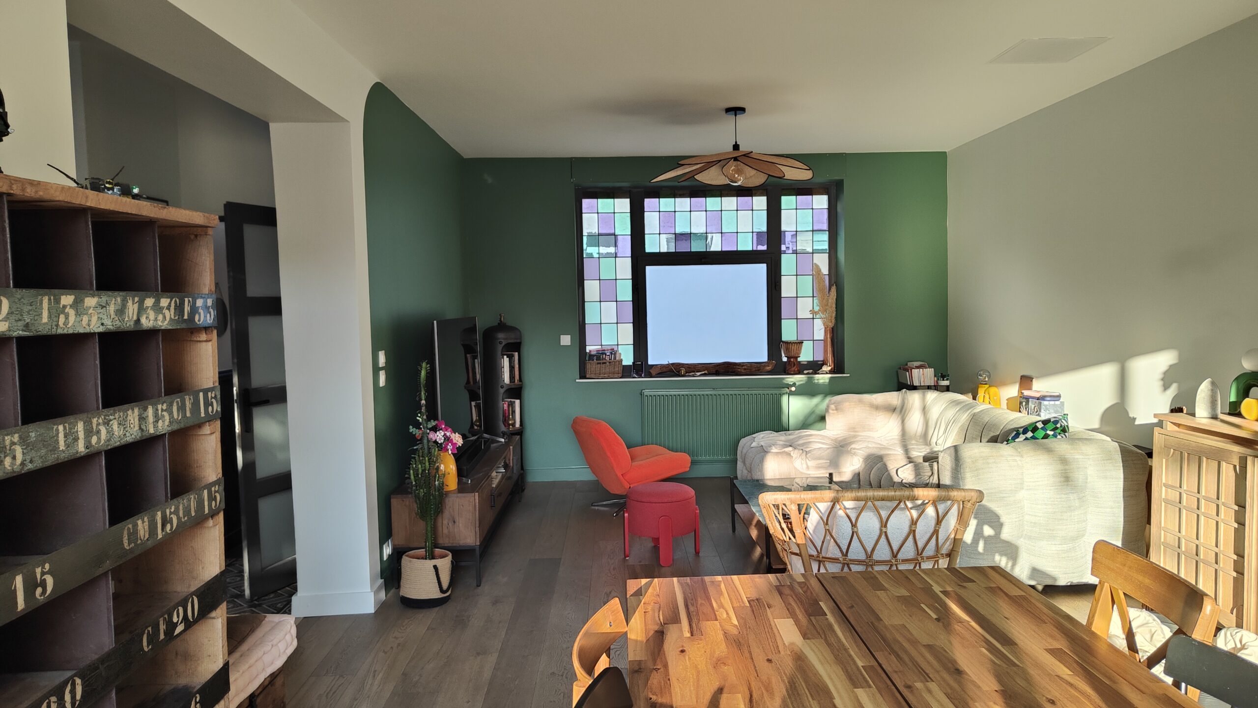 un vert sombre qui donne un aspect cocooning au salon et met en valeur les vitraux de la fenêtre