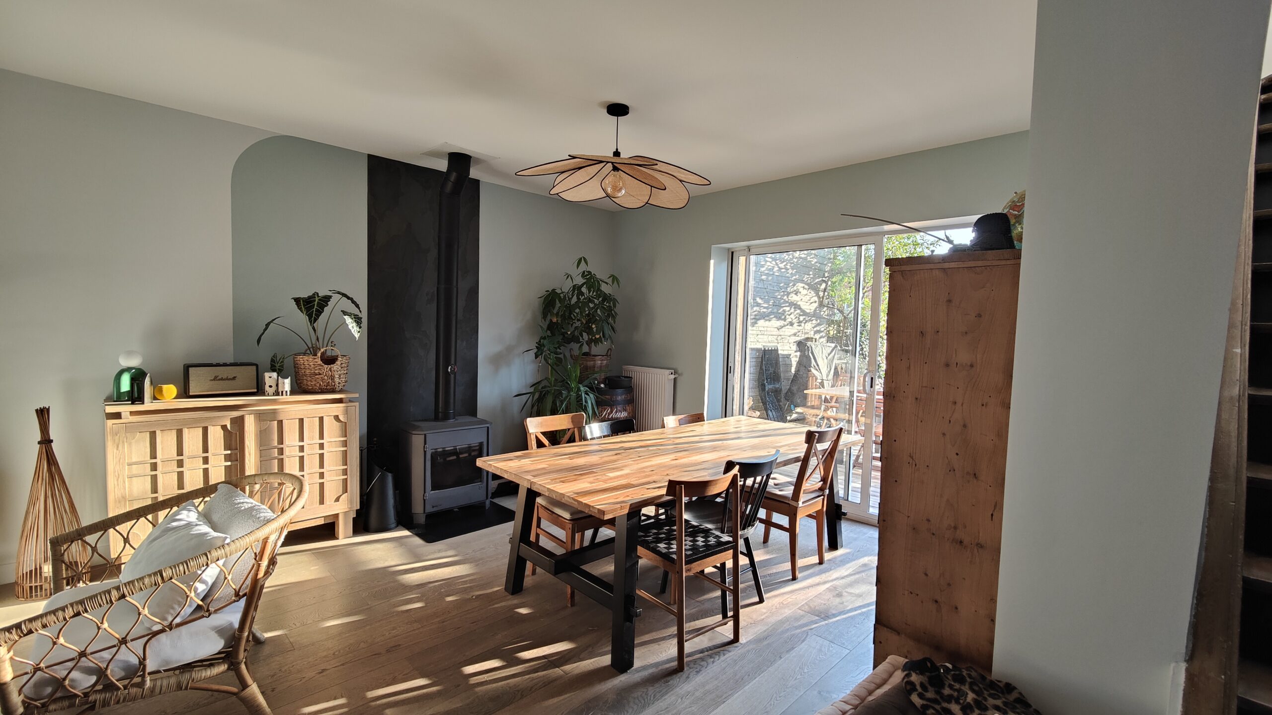 > Quelques nouveaux meubles et accessoires : un buffet en chêne, une table basse avec plateau en marbre vert, des suspensions en matière naturelle