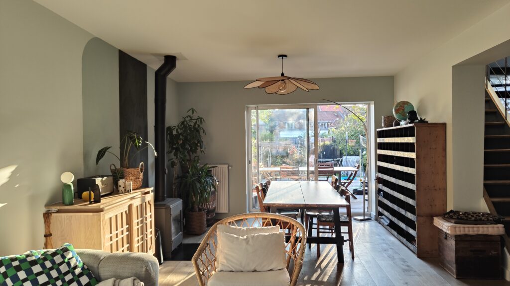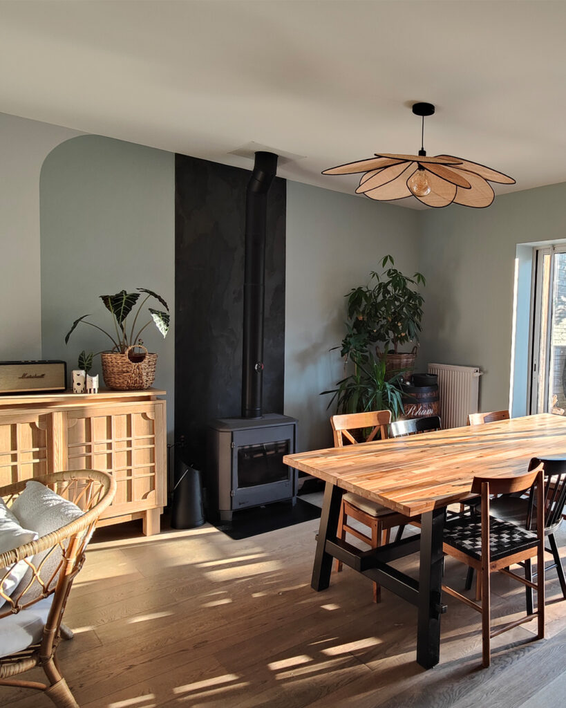 un vert doux plus lumineux pour la partie salle à manger
