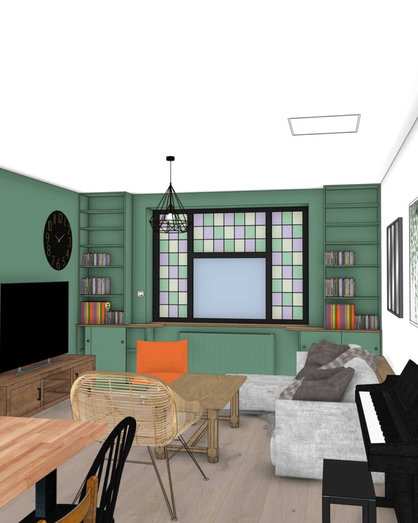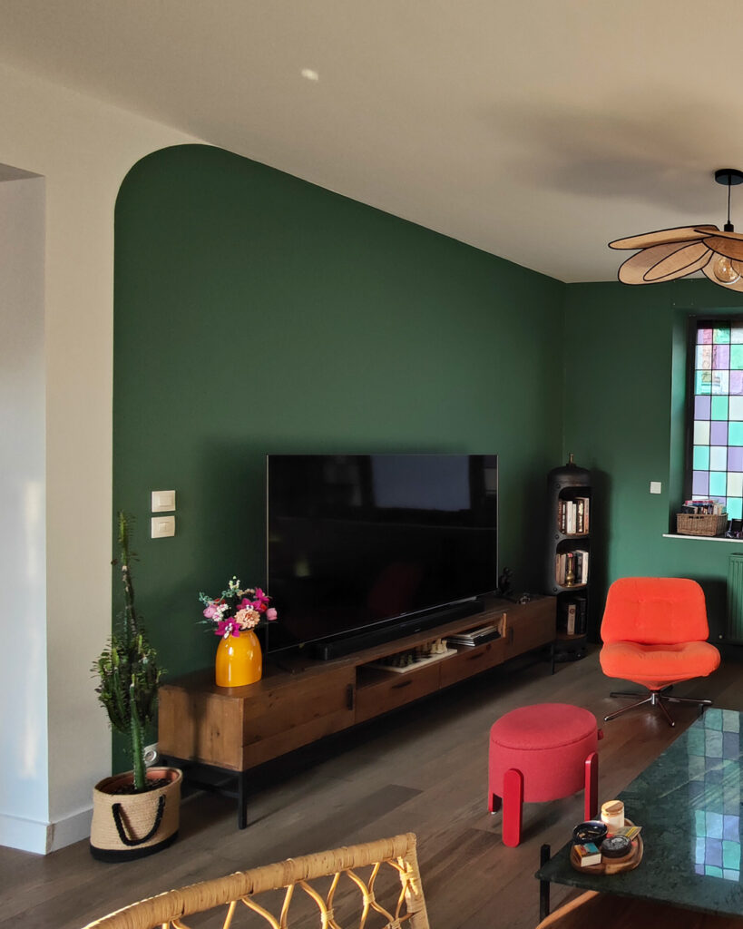 un vert sombre qui donne un aspect cocooning au salon et met en valeur les vitraux de la fenêtre