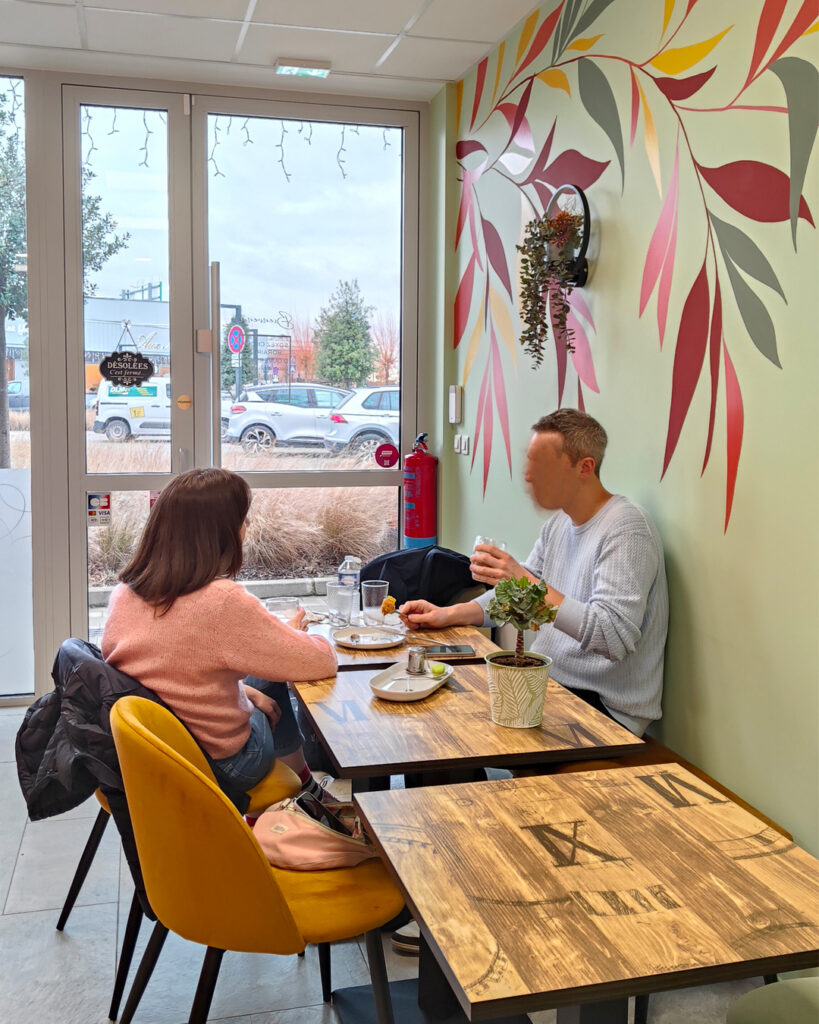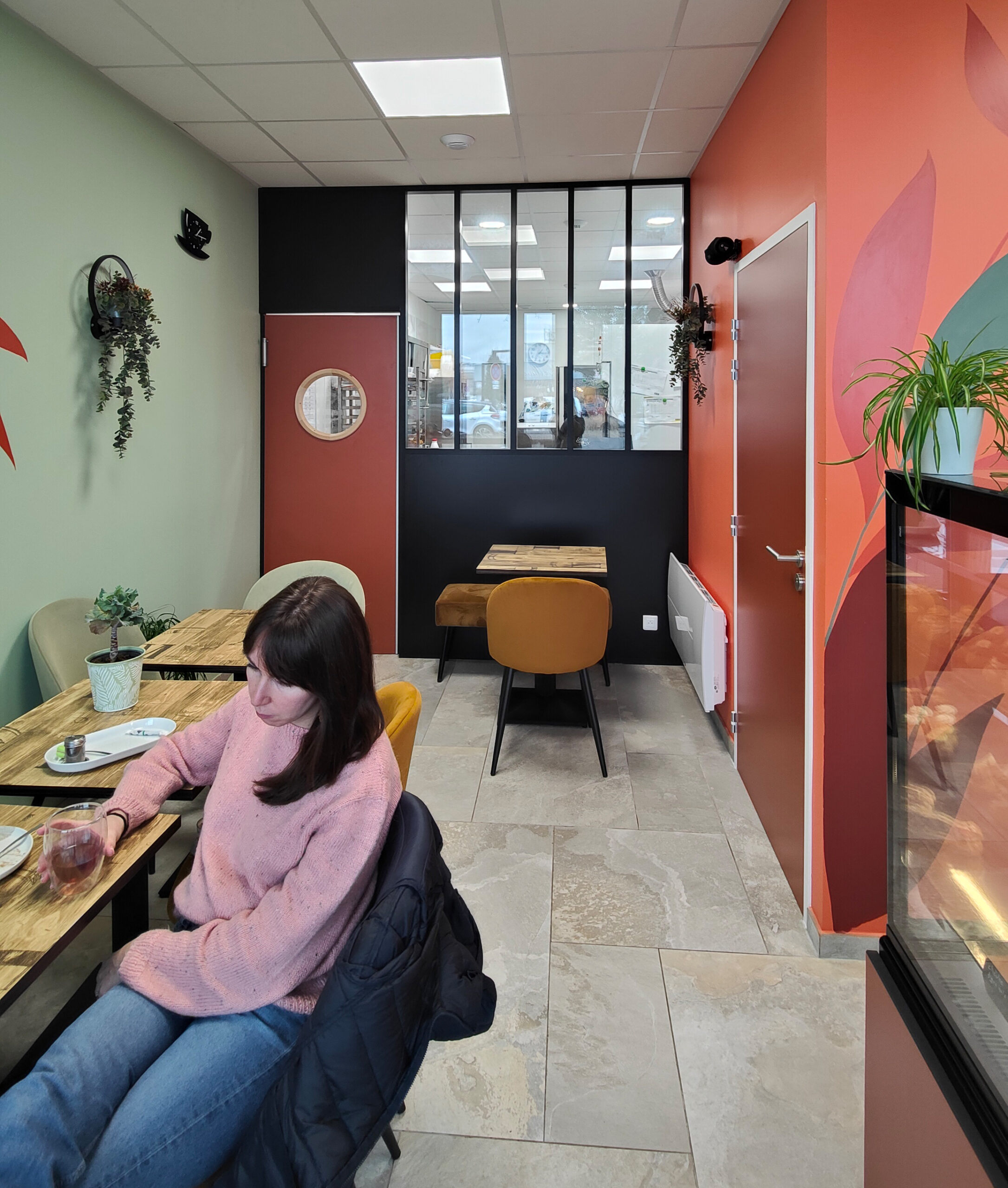 > Une salle avec comptoir et quelques tables pour le service sur place